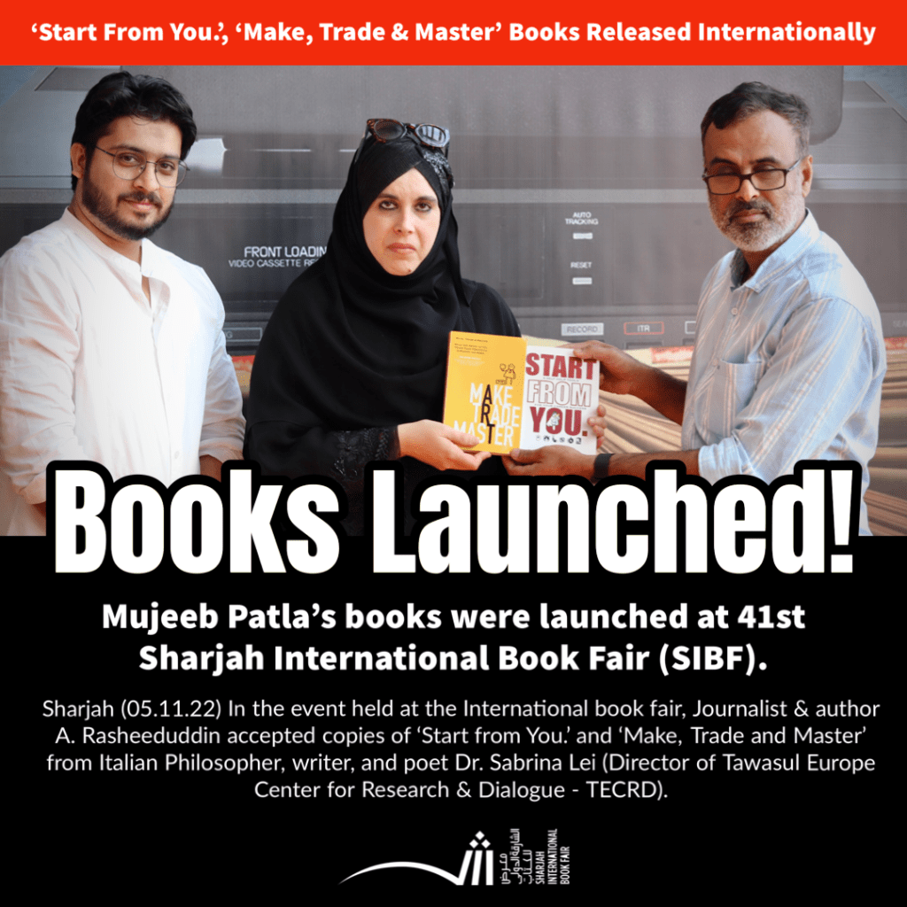 Sharjah (05.11.22) In the event held at the International book fair, Journalist & author A. Rasheeduddin accepted copies of ‘Start from You.’ and ‘Make, Trade and Master’ from Italian Philosopher, writer, and poet Dr. Sabrina Lei (Director of Tawasul Europe Center for Research & Dialogue – TECRD).